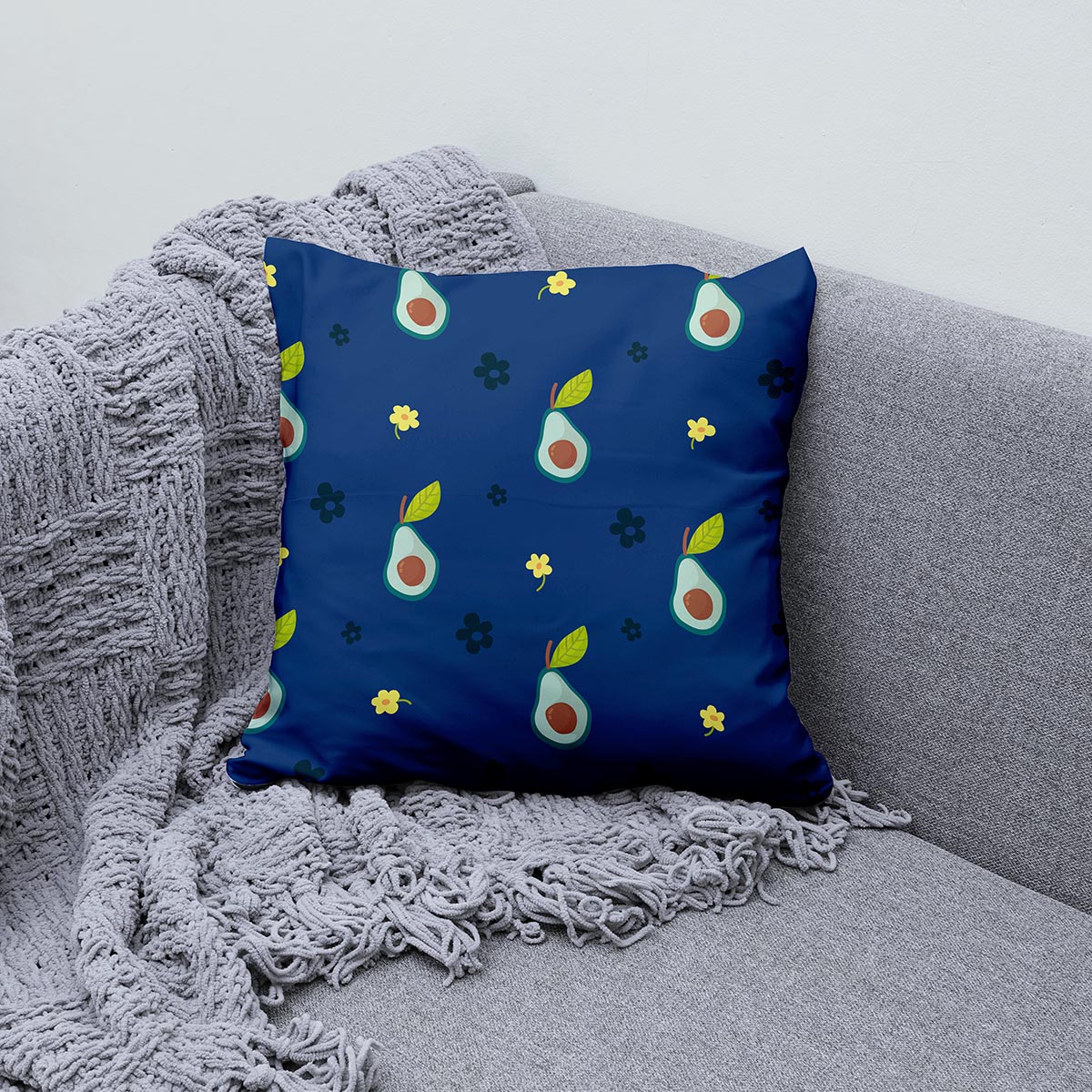 Miękka poduszka ozdobna wniesie żywy akcent do każdego wnętrza. Granatowe tło z wesołymi awokado i drobnymi kwiatkami doda przytulnego charakteru sofie lub sypialni.