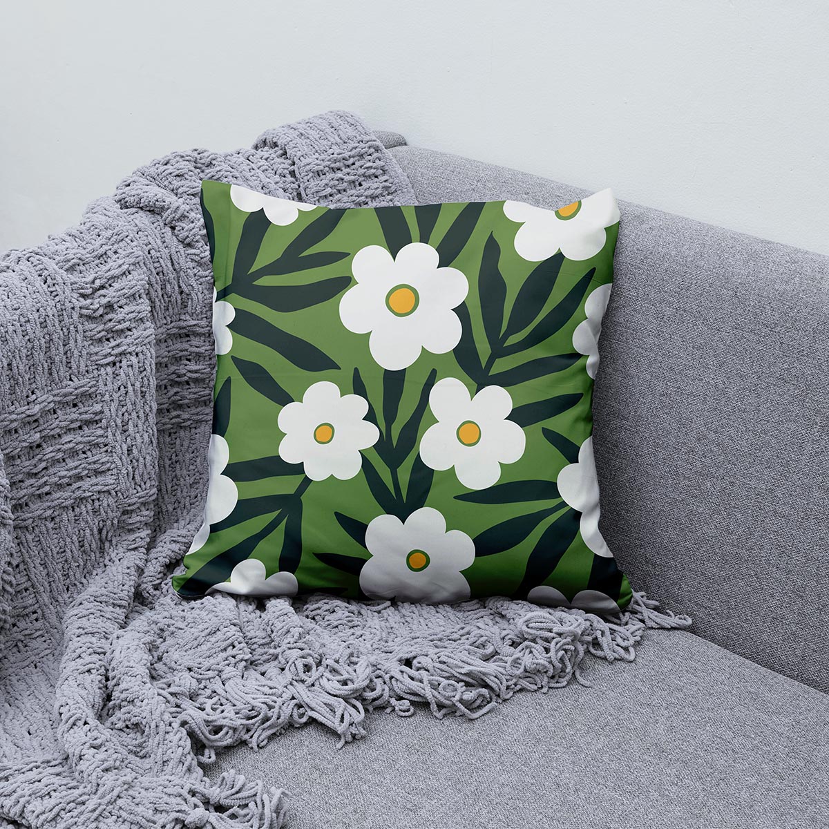 Poduszka dekoracyjna – białe kwiaty na zielonym tle