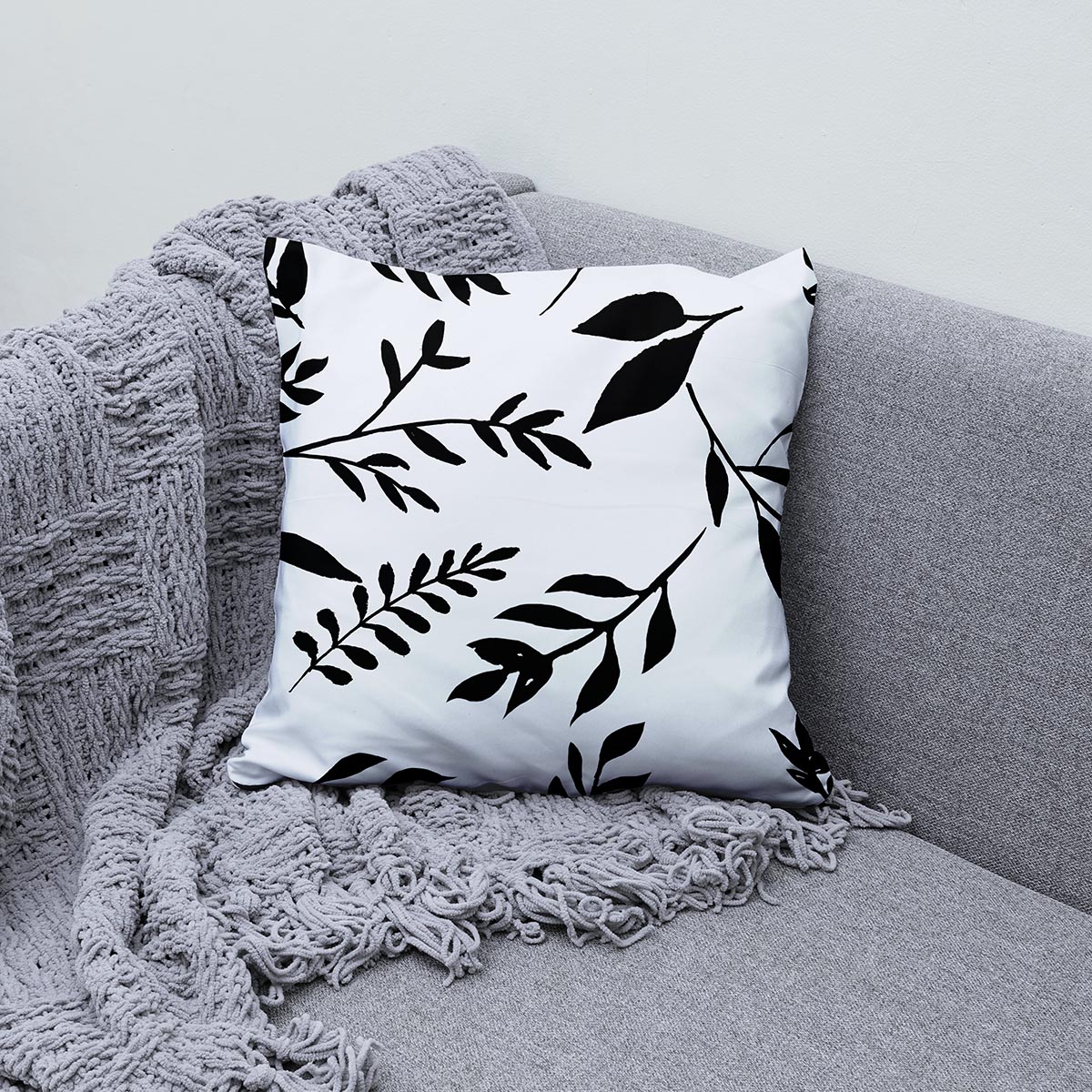Poduszka dekoracyjna – czarno-białe gałązki i liście