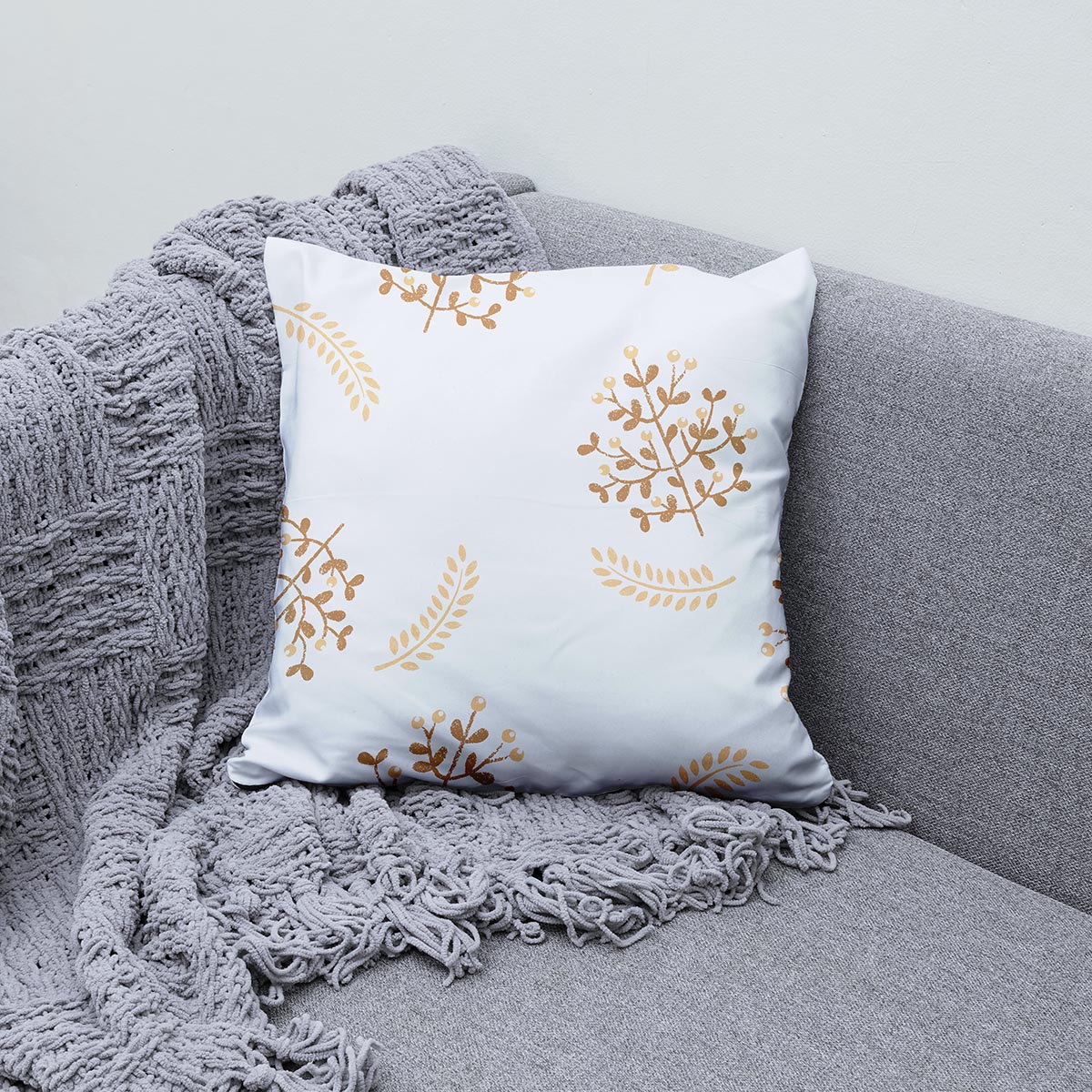 Ta poduszka dekoracyjna przyciąga wzrok spokojnym, roślinnym wzorem w złotym odcieniu na jasnym tle, który wnosi do wnętrza subtelną nutę luksusu. Wzór gałązek i listków podkreśla naturalny charakter aranżacji i pasuje zarówno do nowoczesnych, jak i klasycznych przestrzeni. Poduszka wykonana jest z przyjemnej w dotyku tkaniny i wypełniona antyalergicznym wkładem premium, co zapewnia komfort użytkowania i łatwe utrzymanie formy.