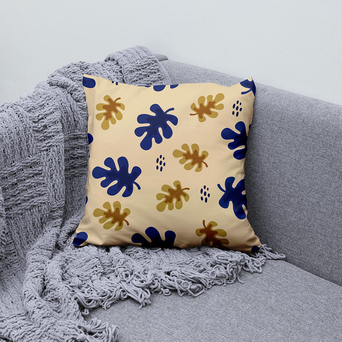 Wyrazisty, graficzny wzór z luźno stylizowanymi liśćmi o głębokim granatowym i złotym tonie na ciepłym, beżowym tle wnosi elegancję i przytulność do wnętrza. Kontrastujące kolory podkreślają nowoczesny charakter, a gładka tkanina subtelnie podkreśla detal nadruku.