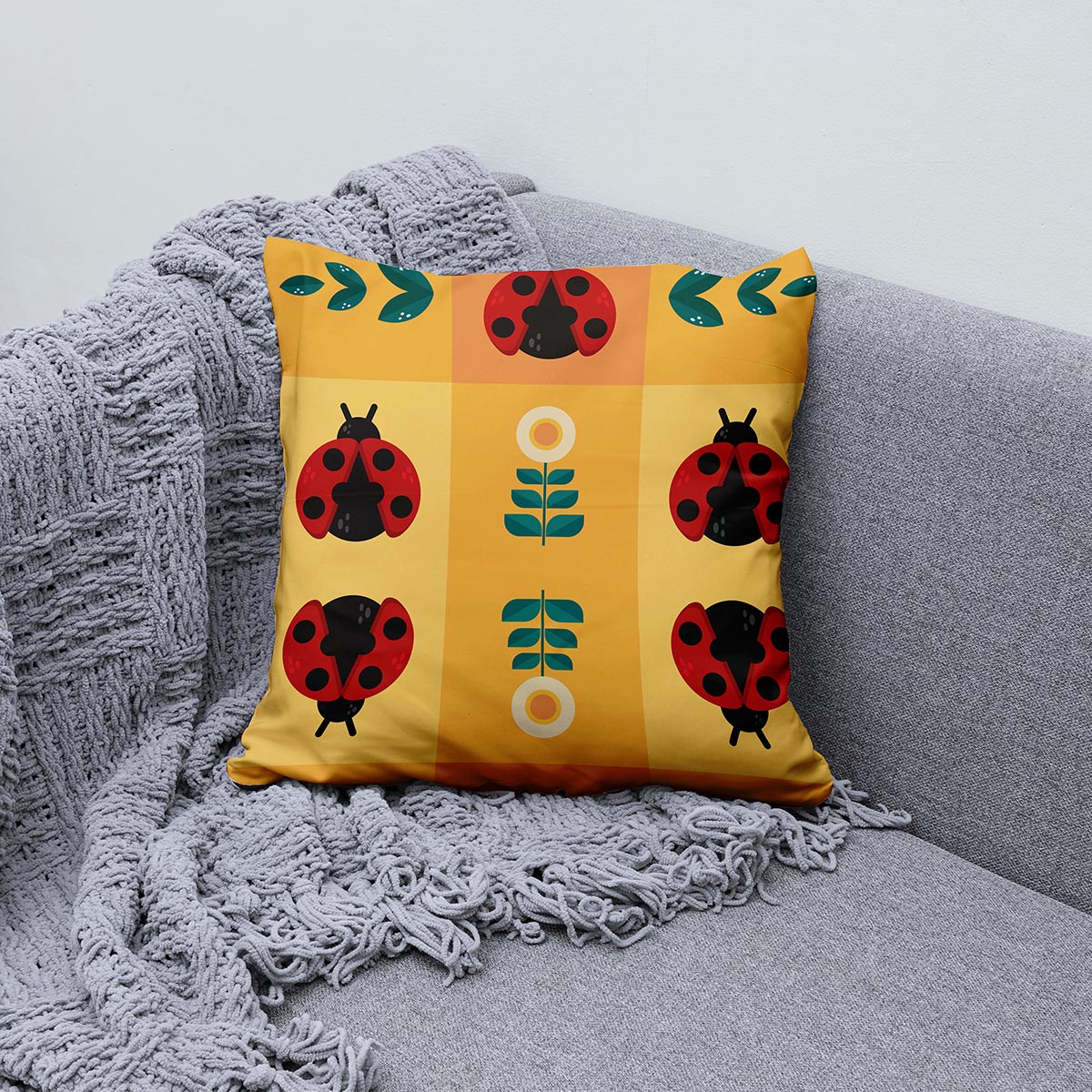 Poduszka dekoracyjna na kanapę – biedronki i kwiaty w kratce