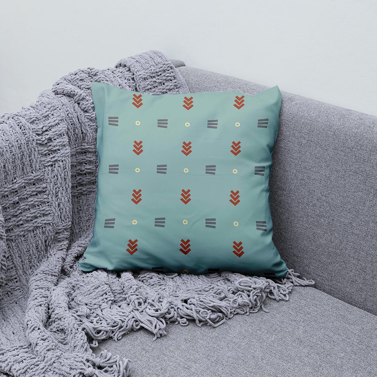Miętowa poszewka z powtarzalnym, prostym wzorem geometrycznym w ciepłych akcentach. Doda wnętrzu nowoczesnego charakteru i harmonii bez przytłaczania aranżacji.