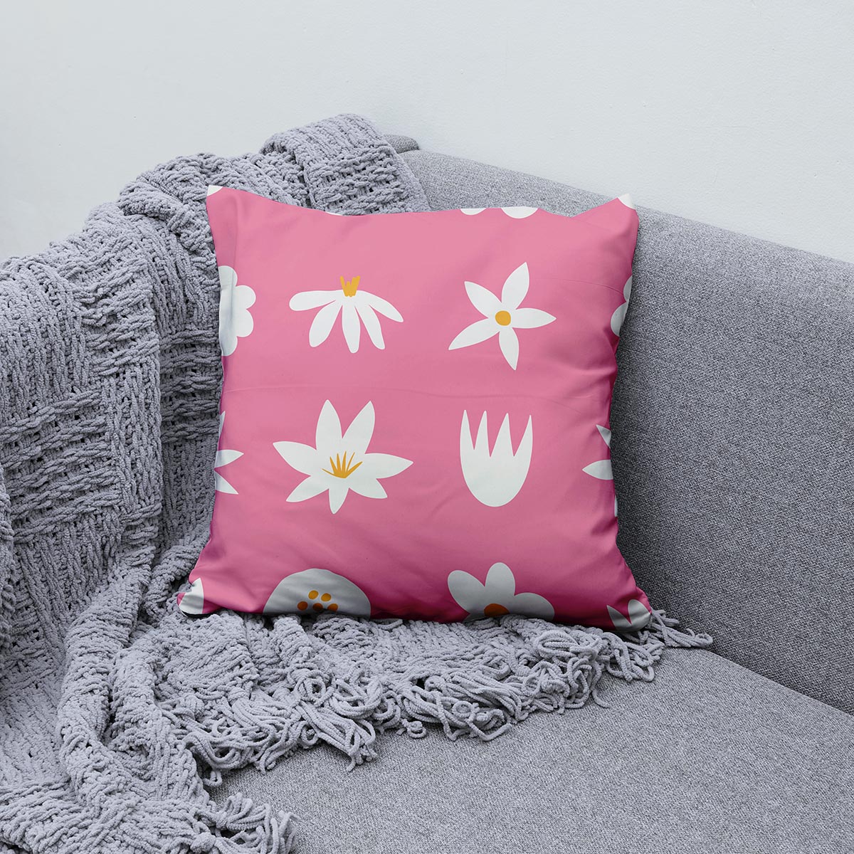 Nasycony róż tła i stylizowane, kremowo-białe stokrotki z delikatnymi żółtymi akcentami tworzą nowoczesny, a zarazem przytulny wzór. Grafika jest prosta i czytelna, dzięki czemu poduszka dobrze komponuje się z gładkimi tkaninami i skandynawskimi wnętrzami.