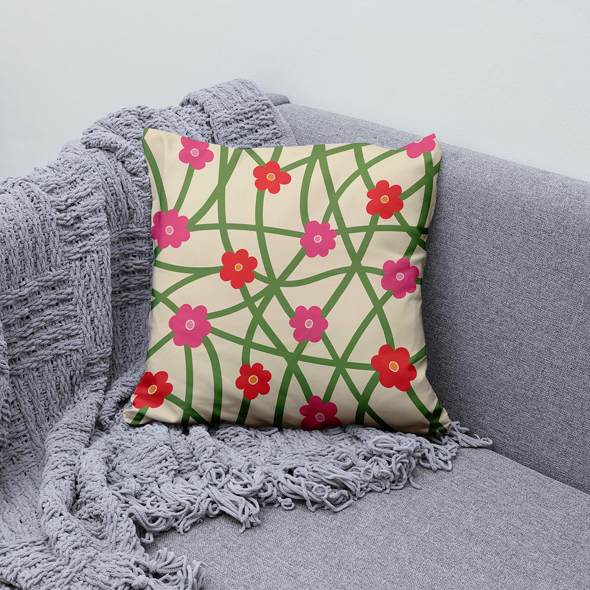 Ta poduszka wyróżnia się prostym, graficznym wzorem zielonych pędów splecionych w siatkę, uzupełnionym drobnymi kwiatkami w odcieniach różu i czerwieni. Neutralne, beżowe tło tworzy subtelne tło dla żywych akcentów kolorystycznych, dzięki czemu wzór pasuje do różnych stylów wnętrz.