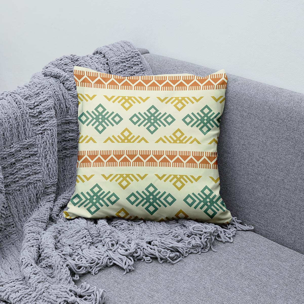 Ta poduszka łączy geometryczne, etniczne motywy z subtelną paletą tonów, tworząc spokojny i elegancki akcent do wnętrza. Kremowe tło przełamane miętowymi i musztardowymi pasami nadaje jej ciepły, stonowany charakter.