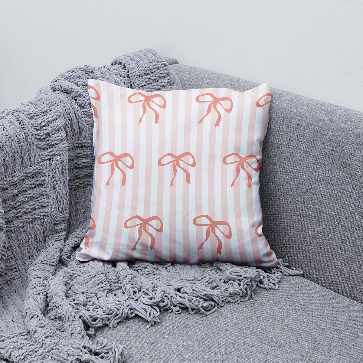 Wzór łączy klasyczne pionowe pasy z finezyjnymi kokardkami w łososiowych tonach, tworząc efektowną, a jednocześnie subtelną kompozycję. Delikatna kolorystyka i rytm graficzny sprawiają, że poduszka świetnie pasuje do sypialni, pokoju dziennego czy przytulnego kącika do czytania.