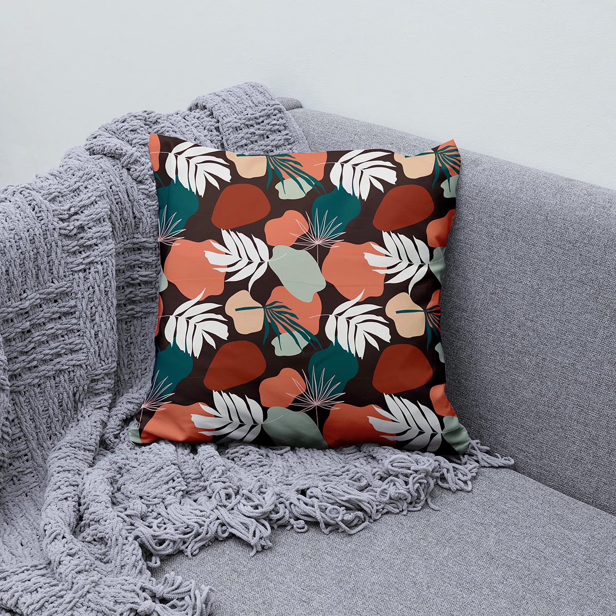 Miękka poduszka dekoracyjna z graficznym motywem liści i nieregularnych plam w ciepłej, naturalnej palecie barw. Dodaje wnętrzu przytulności i nowoczesnego, artystycznego charakteru.