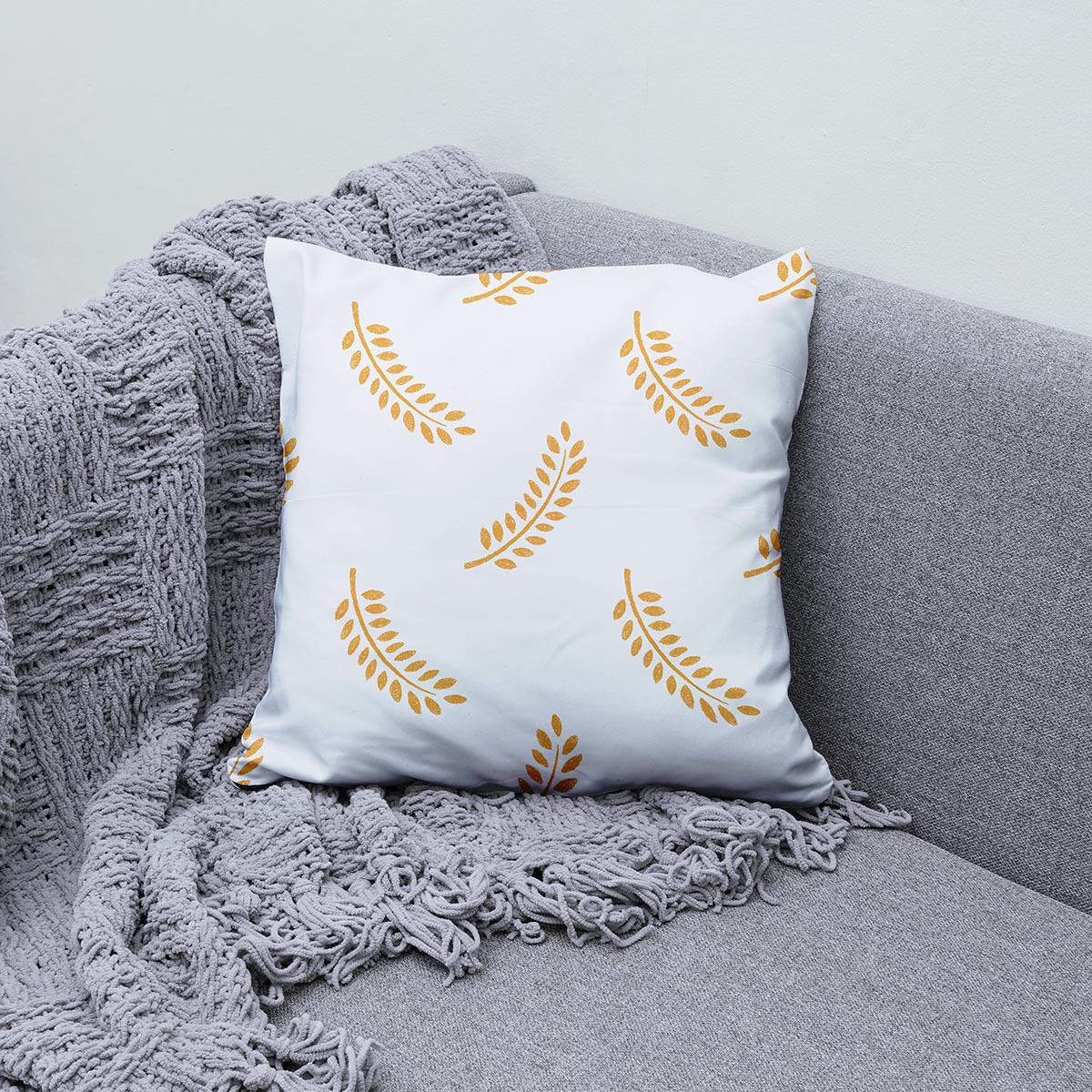 Delikatny, powtarzający się motyw gałązek w ciepłym, złotym odcieniu na jasnym tle tworzy spokojną i elegancką kompozycję idealną do nowoczesnych i klasycznych wnętrz. Wzór jest subtelny, dzięki czemu poduszka doskonale komponuje się zarówno z gładkimi tkaninami, jak i bogatszymi dekoracjami. To kompletna poduszka dekoracyjna z antyalergicznym wkładem premium, która łączy estetykę z wygodą.