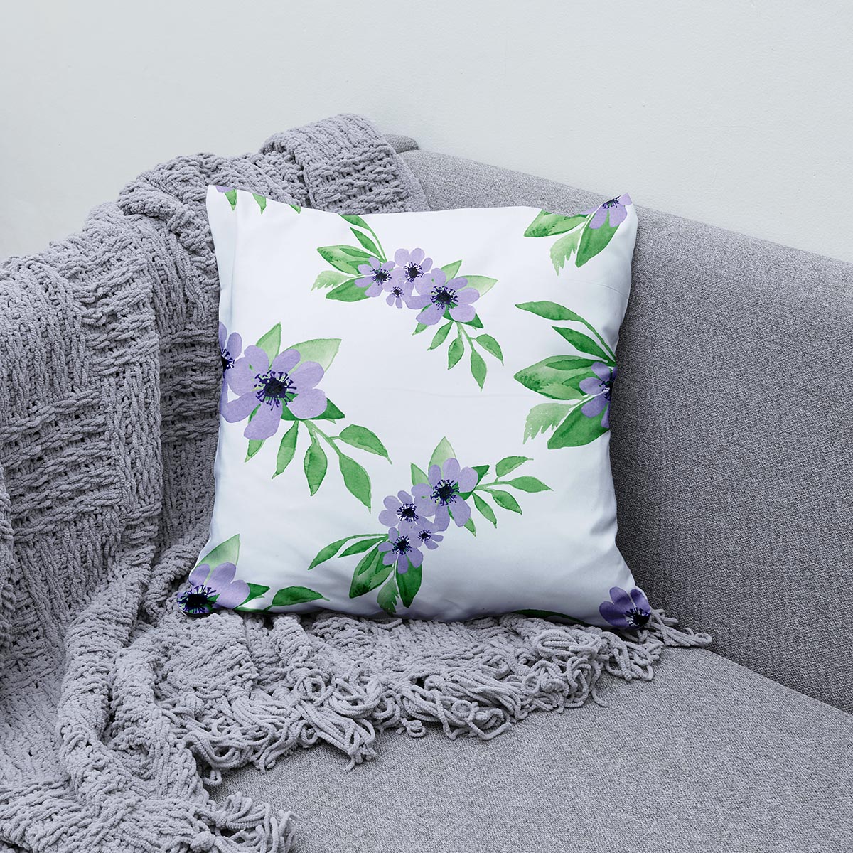 Ta poduszka łączy delikatny, malarski wzór z funkcjonalnością codziennego dodatku. Subtelne, fioletowe kwiaty i świeże zielone liście tworzą lekki, naturalny motyw, który wprowadza spokój i świeżość do salonu lub sypialni.