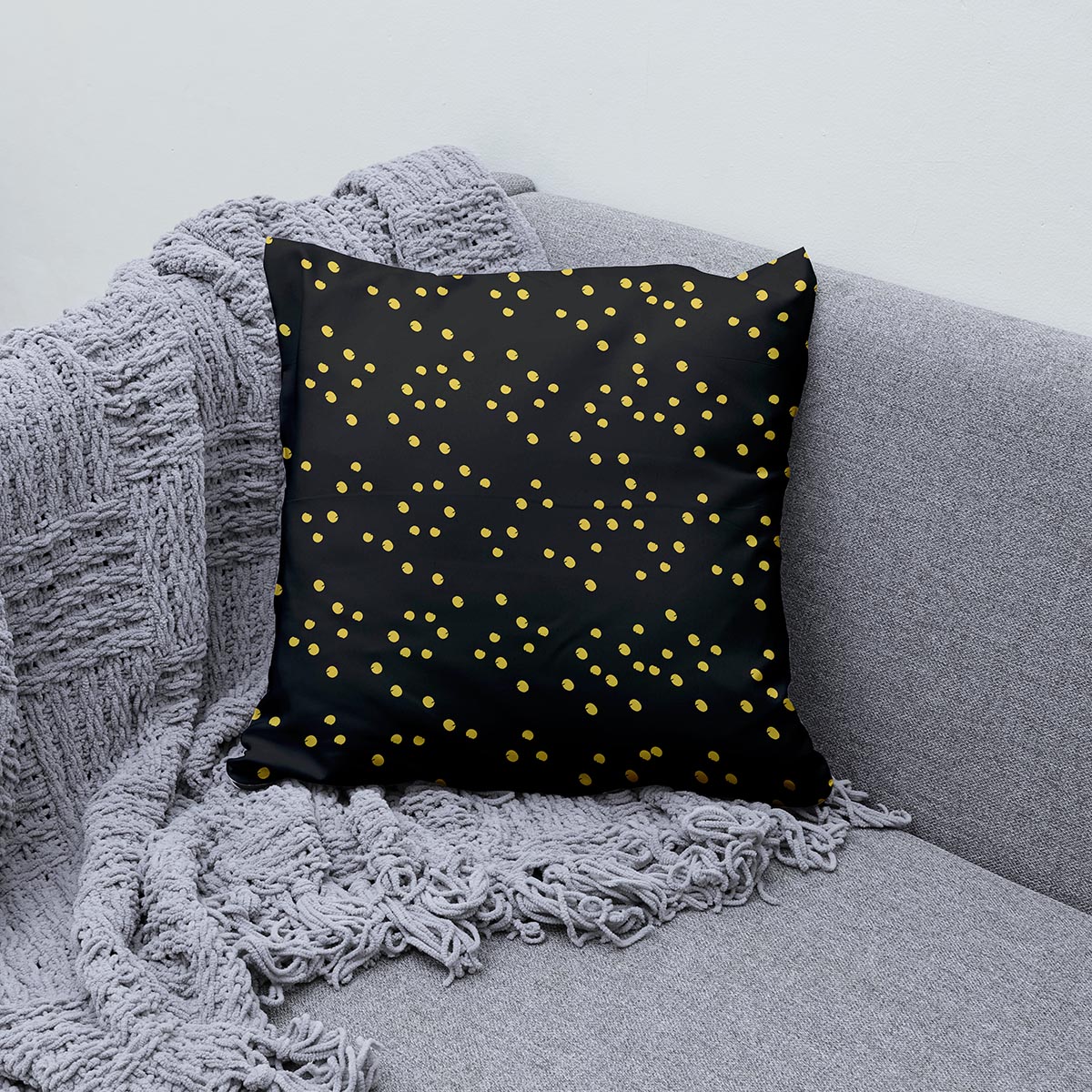 Ten wzór to drobne, nieregularne złote kropki rozsiane po ciemnym tle, które tworzą efekt subtelnego połysku i elegancji. Poduszka świetnie sprawdzi się jako akcent zarówno we współczesnych, jak i klasycznych aranżacjach.