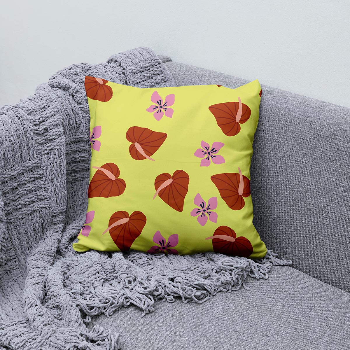 Żółta poduszka dekoracyjna – liściaste serca i różowe kwiaty
