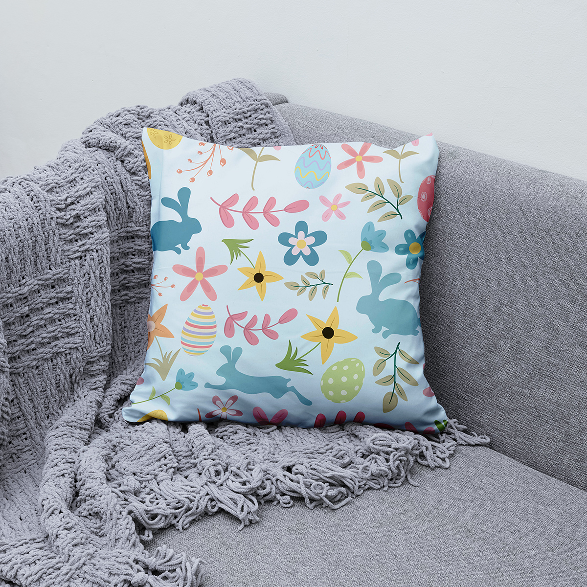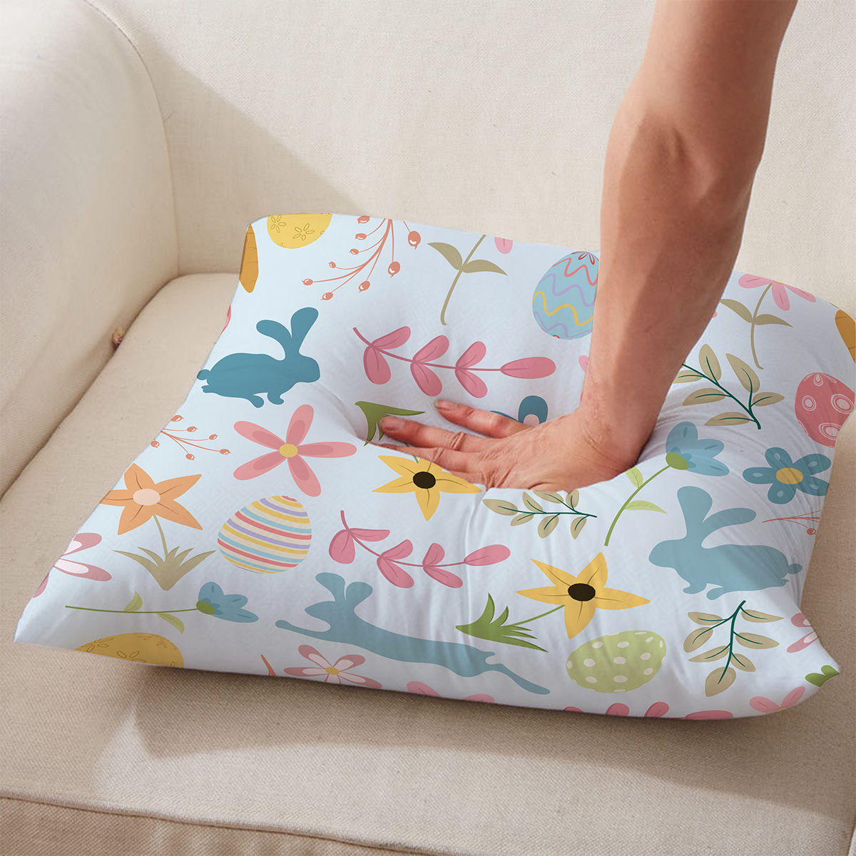 Ta dekoracyjna poduszka przyciąga uwagę delikatnym, wiosennym wzorem: sylwetki zajączków przeplatają się z kolorowymi pisankami i drobnymi kwiatami na jasnym tle. Pastelowa paleta nadaje całości lekkości i sprawia, że wzór pasuje do wielu stylów wnętrzarskich.