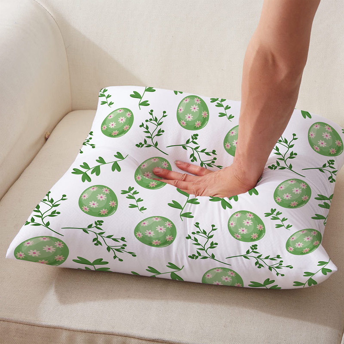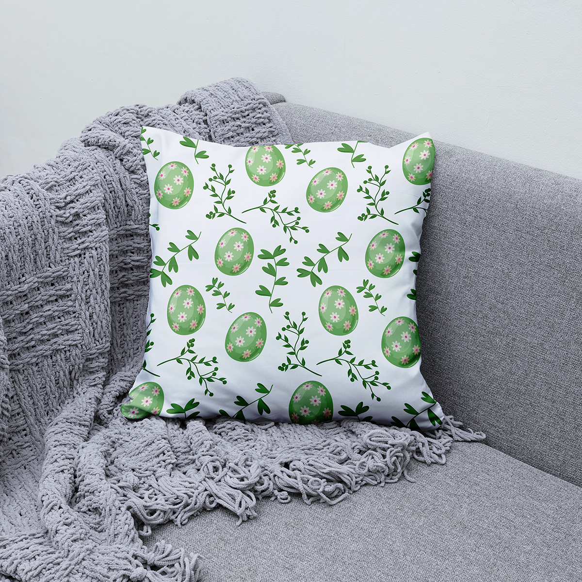 Miękka poduszka ozdobna z delikatnym wzorem zielonych pisanek i drobnych gałązek doda świeżości każdemu wnętrzu. To uniwersalny akcent dekoracyjny, który wprowadzi wiosenny klimat do salonu, sypialni lub na taras.
