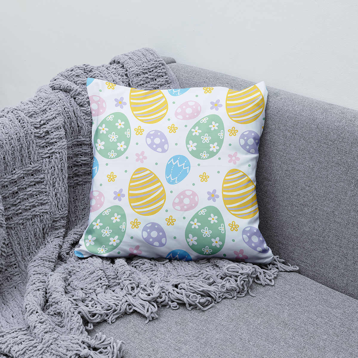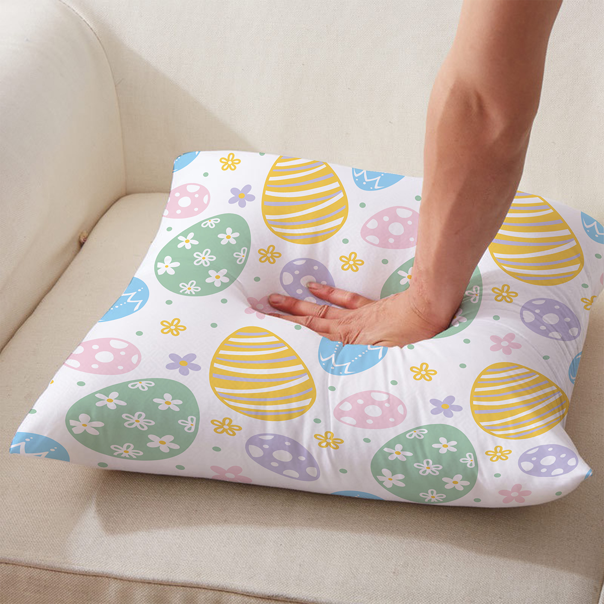 Delikatny wzór z pisankami i drobnymi kwiatkami w pastelowych odcieniach wnosi wiosenny nastrój do wnętrza. Miękka i dekoracyjna poduszka sprawdzi się na kanapie, fotelu lub w sypialni.