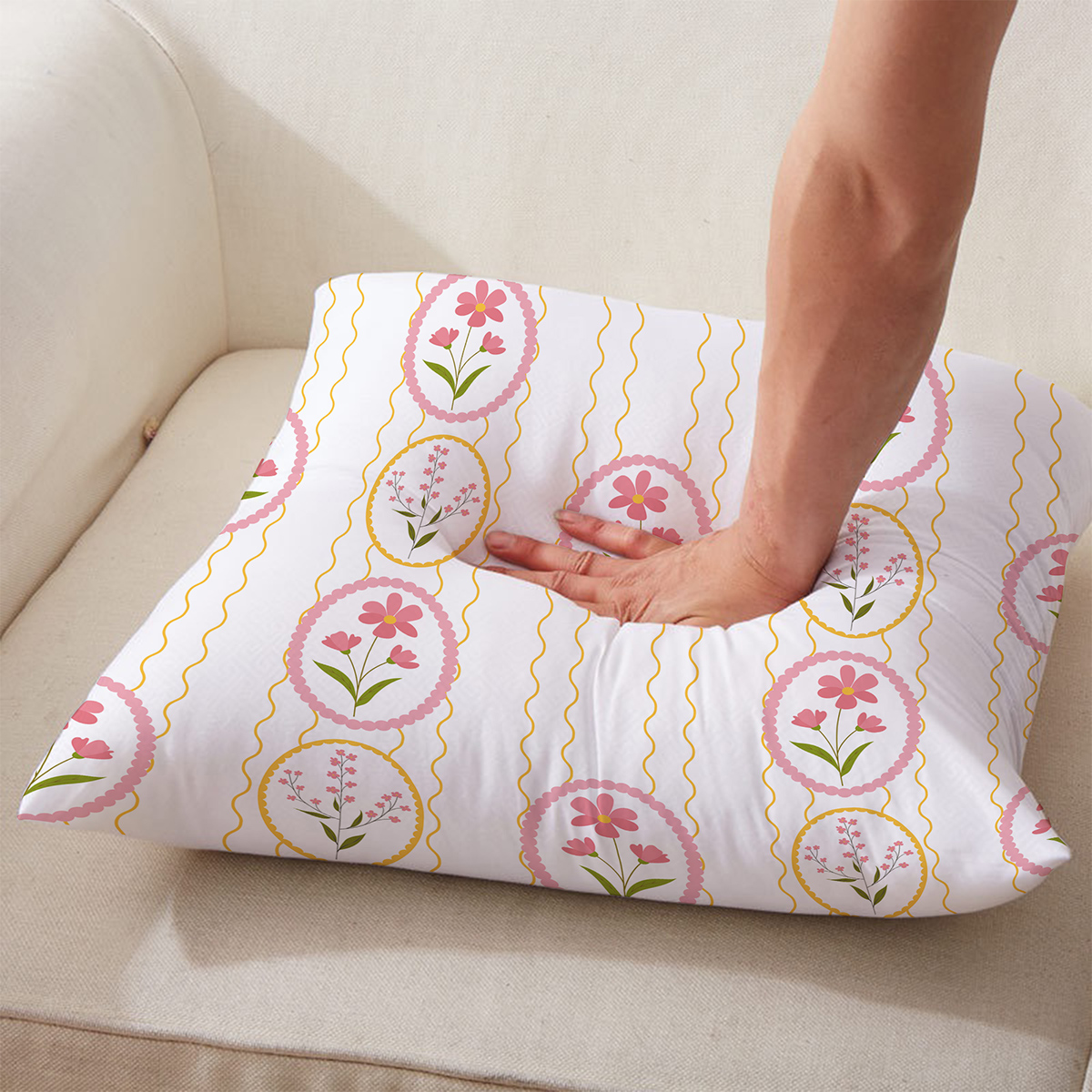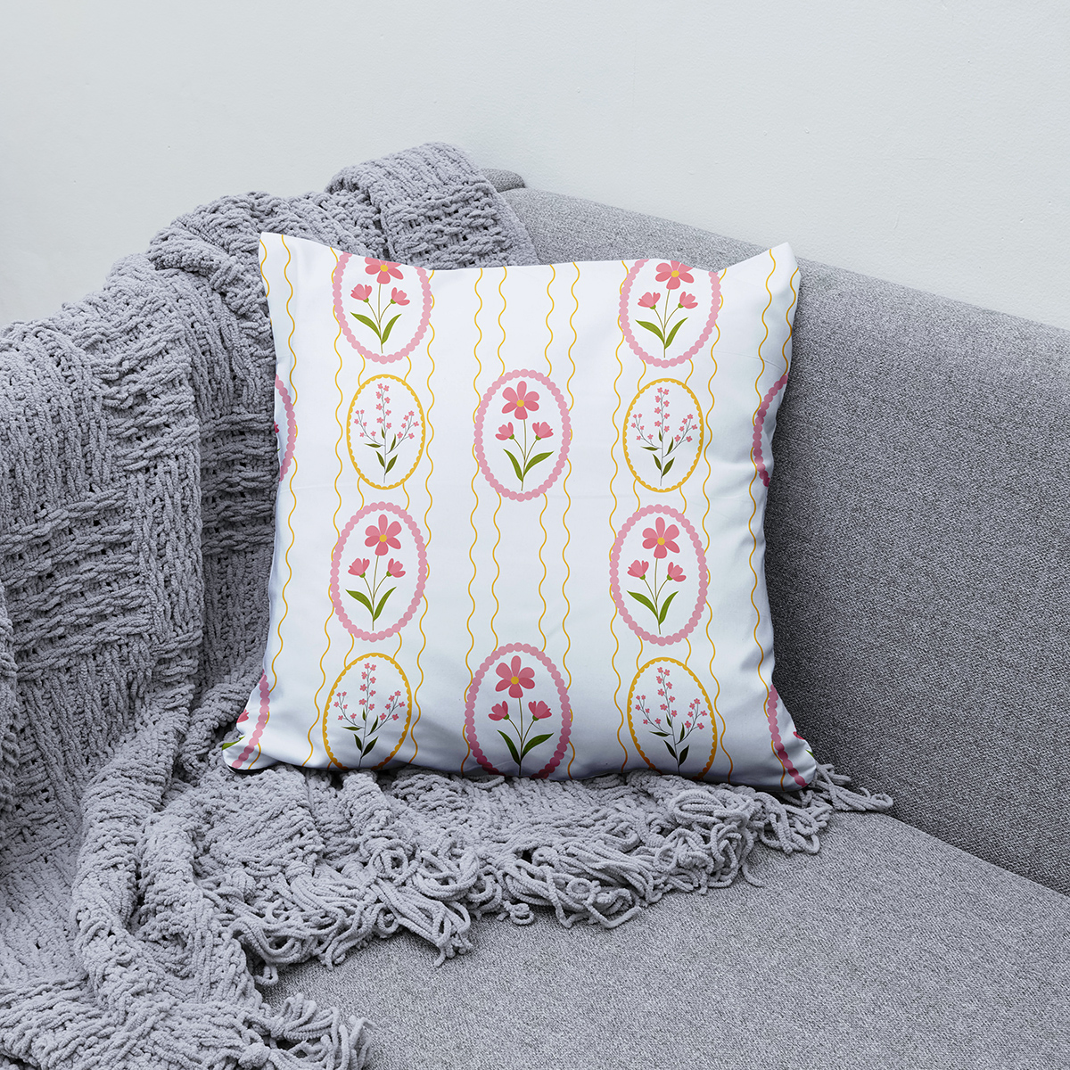 Urocza poduszka z delikatnym wzorem pisanek i drobnych różowych kwiatów doda wiosennego nastroju każdemu wnętrzu. Miękka w dotyku i subtelna w kolorystyce, sprawdzi się jako dekoracja kanapy lub sypialni.