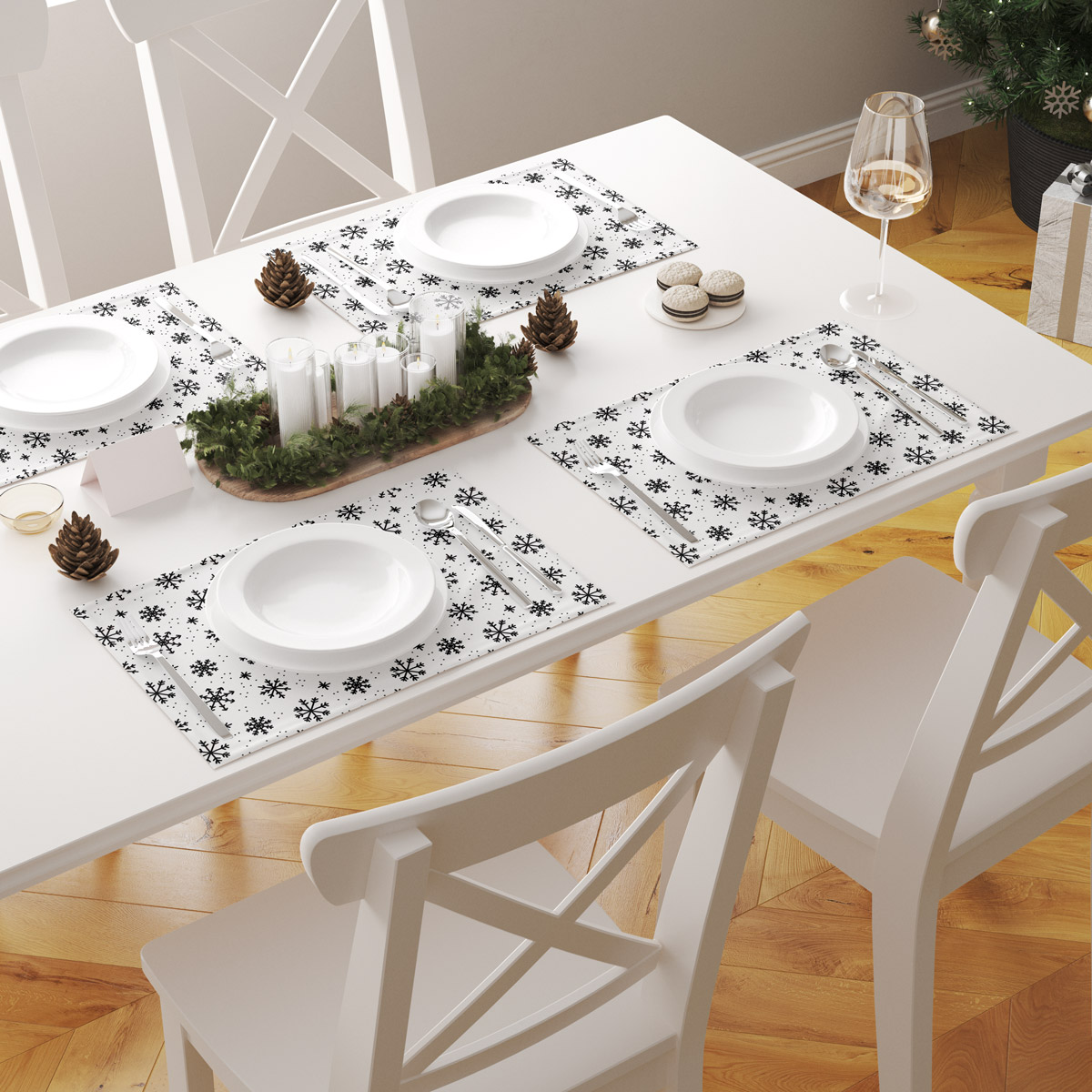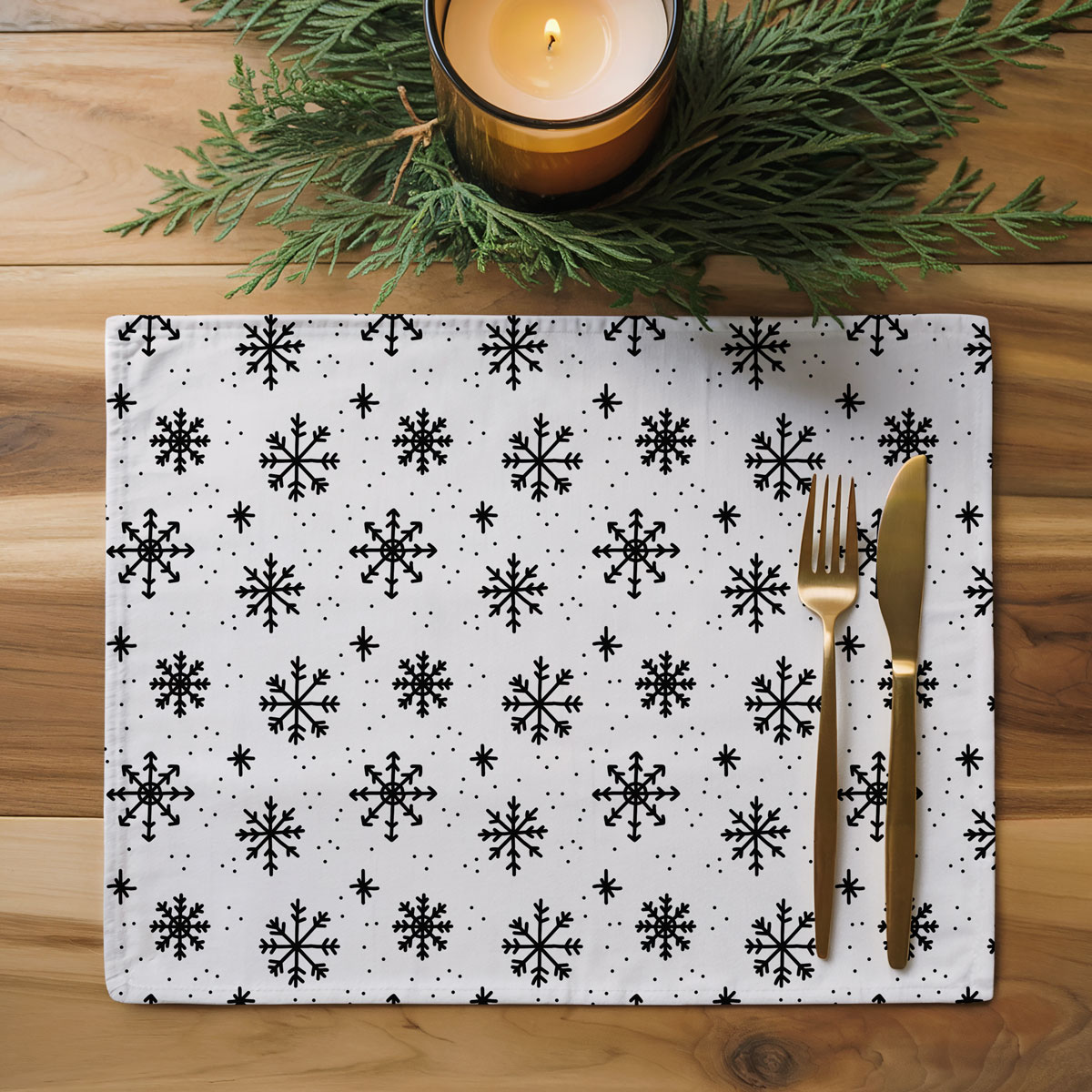 Białe podkładki na stół z czarnym wzorem płatków śniegu. Minimalistyczny, elegancki design w zimowym klimacie – idealny dodatek do jadalni w sezonie zimowym.