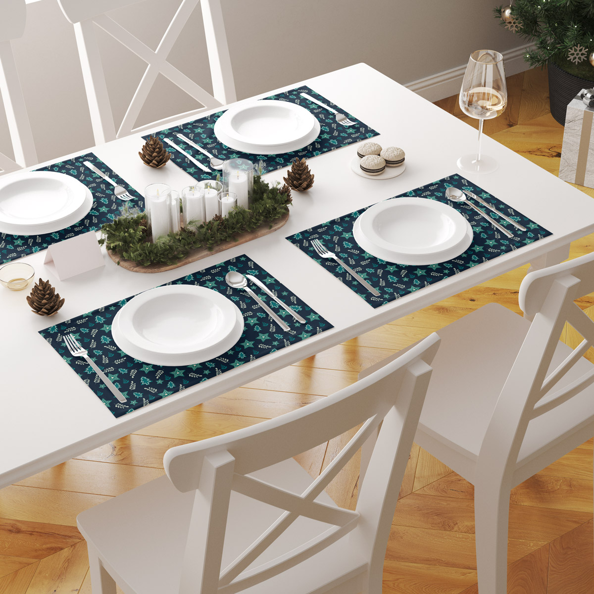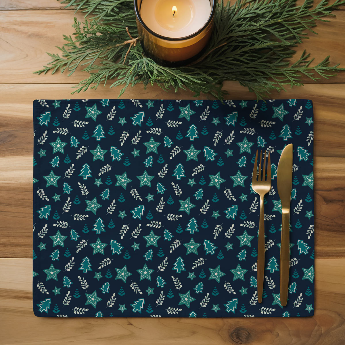 Granatowe podkładki świąteczne z motywem choinek i gwiazdek. Elegancki i nastrojowy akcent, który doda stołowi wyjątkowego charakteru w zimowym sezonie.