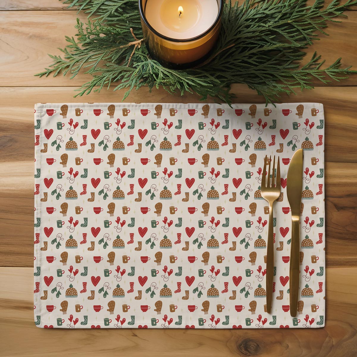 Urocze podkładki w stylu skandynawskim wprowadzą do wnętrza ciepły, przytulny nastrój. Kremowe tło z motywem czapek, serduszek, kubków i rękawiczek w odcieniach czerwieni, zieleni i brązu tworzy harmonijną i radosną kompozycję.